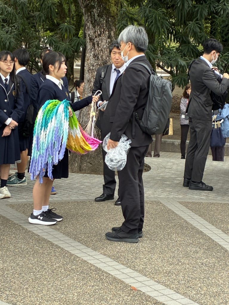 Today, we visited the Atomic Bomb Dome and the Hiroshima Peace Memorial Museum. We offered a thousand paper cranes folded by the second-year students to honor the victims and learned about peace. After that, we took the Shinkansen to Kyoto and explored the grounds of Kiyomizu-dera Temple. For dinner, we had sukiyaki, and ended the day with a comedy show by Yoshimoto. It was a day full of laughter and learning