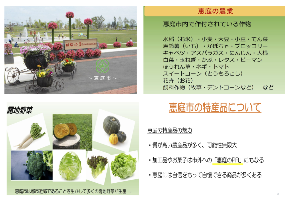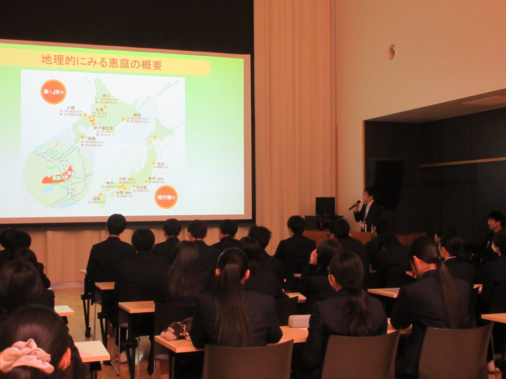 12 月 4 日(木) 、 食物科 1・ 2 年生が恵庭市の特色について勉強会を実施しました。 目的は、 恵庭市の特色への理解を深め、 商品開発やコンクール入賞に向けての創造力をさらに広く深くするためです。みんな、がんばろう!!