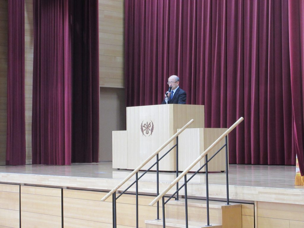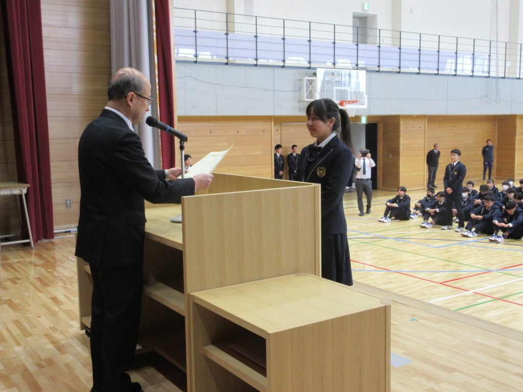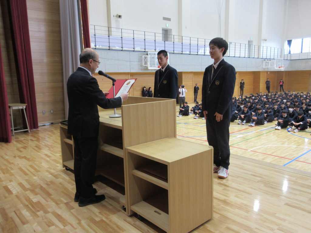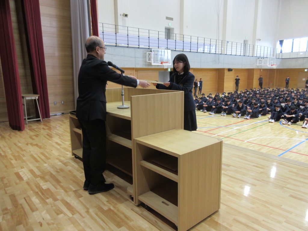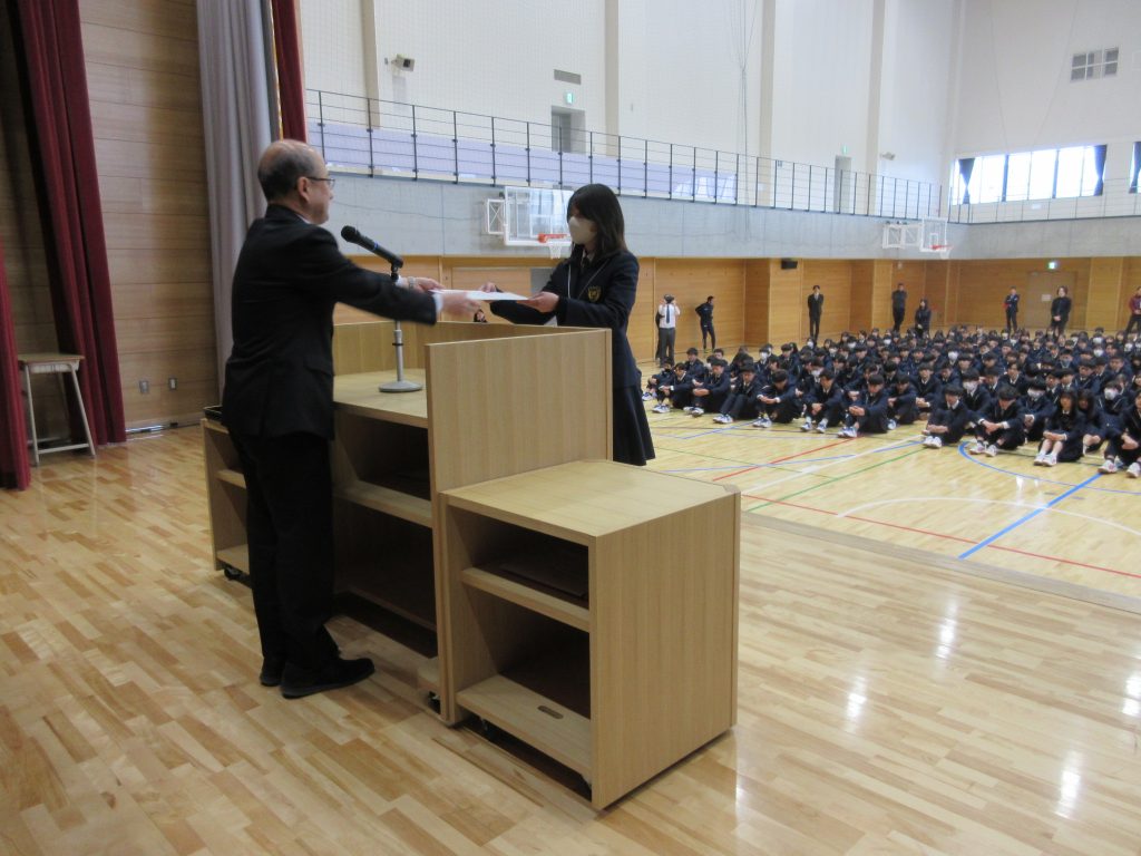 1/13(火)冬季休業明け集会が行われました。 集会では冬休み中に開催され、食物科2年生ペアが出場した牛肉料理甲子園(会長賞受賞)と吹奏楽部が出場し、それぞれ金賞を受賞したアンサンブルコンテスト及び管楽器個人コンテストの伝達表彰、校内読書感想文の表彰が行われました。 その後、校長先生から年始のお話しをいただき、2時間目から授業等が始まりました。